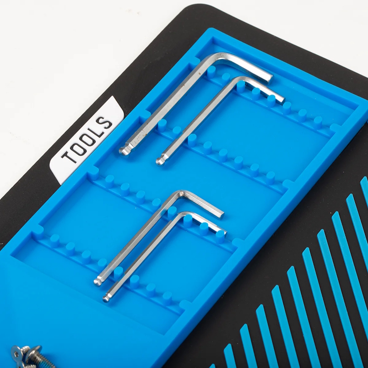 De gegroefde gereedschapsbak, de magnetische onderdelenbak en de opstaande rand voorkomen dat kleine onderdelen zoals schroeven, veren of kogellagers van het werkoppervlak rollen. Het verhoogde logo zorgt voor een stevige grip op uw marker zonder deze te beschadigen, waardoor een stabiele en veilige werkplek gegarandeerd is.