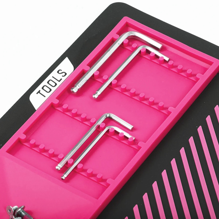 De gegroefde gereedschapsbak, de magnetische onderdelenbak en de opstaande rand voorkomen dat kleine onderdelen zoals schroeven, veren of kogellagers van het werkoppervlak rollen. Het verhoogde logo zorgt voor een stevige grip op uw marker zonder deze te beschadigen, waardoor een stabiele en veilige werkplek gegarandeerd is.