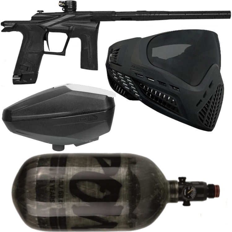 Complete paintballset voor toernooisporten, bestaande uit de EGO LV2, de Protoyz Speedster Loader, een lichtgewicht composiet HP-systeem met 300 bar vuldruk en een VIO Ascend-masker.