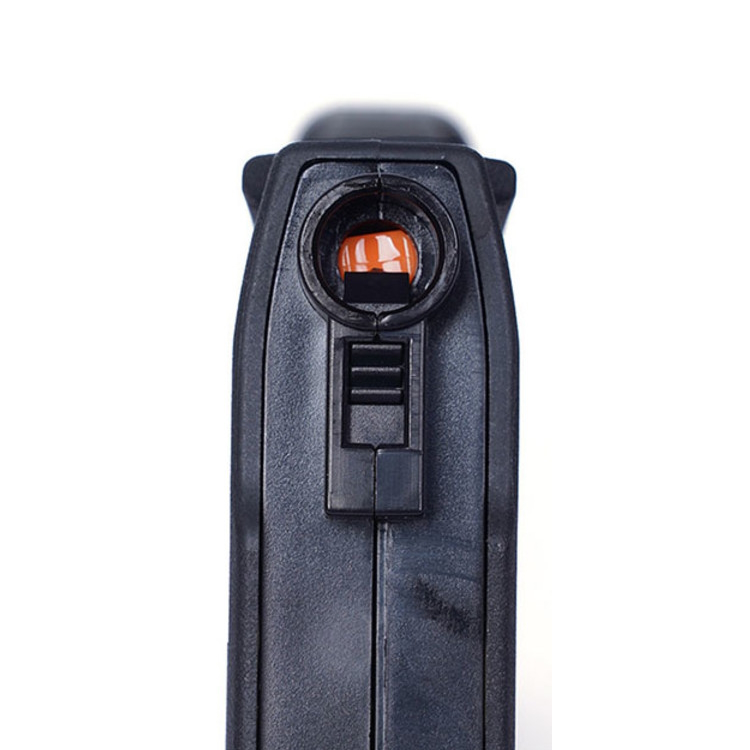 Feloranje indicator voor volle lading: Wanneer het magazijn volledig geladen is, verschijnt een oranje indicator onderaan het transparante venster voor de kogel. Dit is een opvallend ontwerpkenmerk dat uniek is voor de EPM, omdat de gebruiker hierdoor elk EPM-magazijn kan oppakken en direct kan zien of het volledig geladen en klaar voor gebruik is. Het dient tevens als visuele indicator om te bepalen wanneer het laden van het magazijn moet worden gestopt.