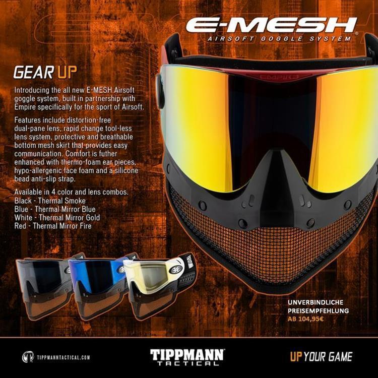 Tippmann heeft dit idee nu opgepakt en het E-Mesh beschermingsmasker ontwikkeld. De E-Mesh is gebaseerd op het hooggewaardeerde Empire E-Flex paintballmasker. Het brilmontuur, de thermische lenzen, de oorkappen en de maskerband zijn allemaal overgenomen van de beproefde E-Flex en voorzien van een stevig gaas bij de mond.